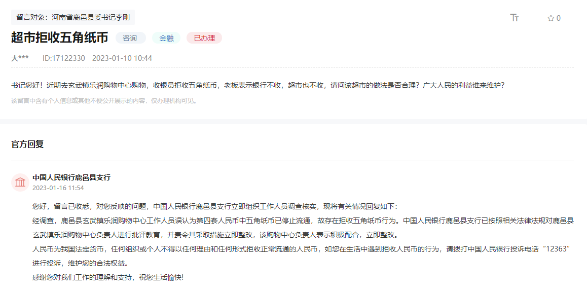 同时,中国人民银行鹿邑县支行还在回复中进一步说明:人民币为我国法定货币,任何组织或个人不得以任何理由和任何形式拒收正常流通的人民币,如您在生活中遇到拒收人民币的行为,请拨打中国人民银行投诉电话“12363”进行投诉,维护您的合法权益。