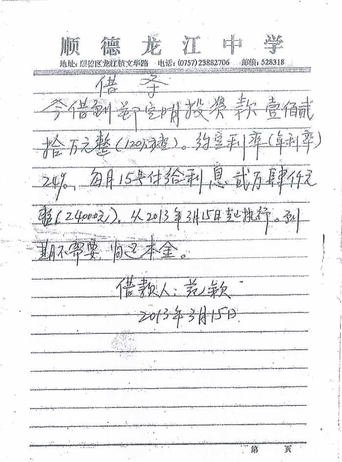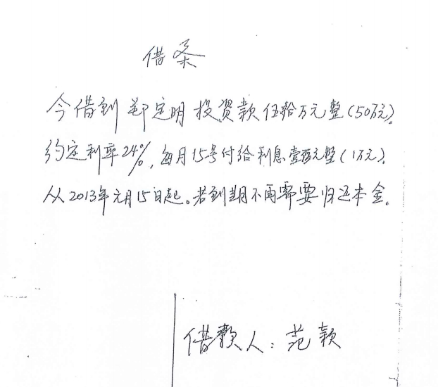 “我们于2012年12月开始第一次投资,给了50万,约定每个月利息1.25万。之后陆续把亲戚家的钱私转出来,由范颖写借条、记账、给利息、以及跟张海燕写合同等事情,后来又多次做短期;做短期的钱又积累说如果到一年就算做长期,不到一年就算短期。