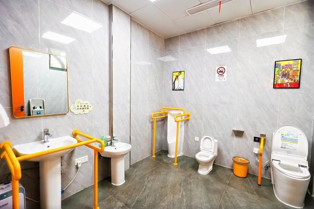 古美路街道的一座公厕,“溷轩”为厕所的雅称。本文图片来源 上海市绿化市容局上海市绿化市容局表示,面对社会老龄化趋势与市民多元化如厕需求,上海将“环卫公厕适老化适幼化改造”作为重要民生工程,自2023年将此纳入市政府实事项目以来,三年累计完成改造2631座,超额完成目标。改造中坚持“分层分类、全龄友好”原则,聚焦“通行安全、助力行走、自主如厕、服务优化”四大类30项细节进行系统升级。通过为老年人加装无障碍扶手、铺设防滑地砖、优化照明,为儿童设置低位洗手盆、儿童坐便器、加装防撞护角等举措,显著提升了“一老一小”群体的如厕安全性与便利度。