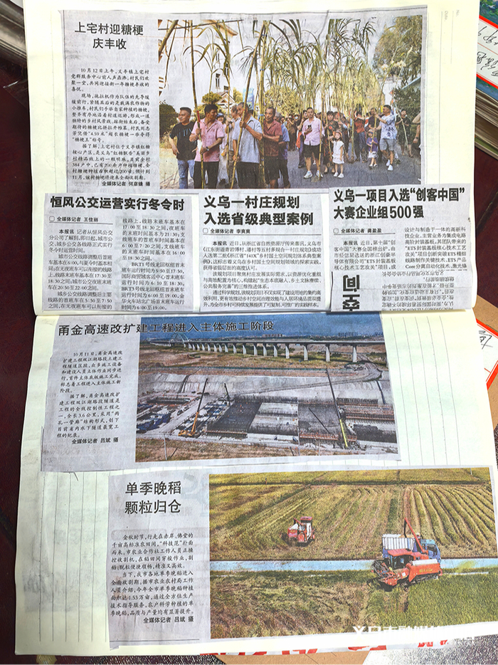 在他最新的剪报册——2025年7月的《义乌风光集》中,赤岸镇首届橘子丰收节的欢快场景、义乌双层观光巴士开通的热闹景象、恒风公交实行冬令时的便民通知、甬金高速改扩建工程的施工进展……这些看似平常的新闻,都被他精心剪贴,按时间顺序排列。“把这些连起来看,就是义乌发展的脚步。”他说。截至目前,他已做了41本《义乌商报》剪报册。