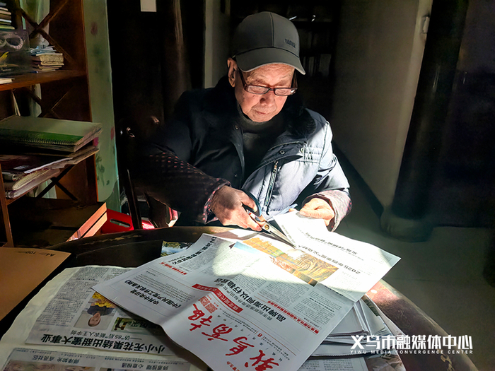 每天清晨,当第一缕阳光照进乔亭村的老屋时,冯树有已经端坐在桌前。桌上总是摆着一份当天的《义乌商报》,旁边放着老花镜和一支准备随时划线的笔。“先看一版时政大事,再翻民生、市场、文化版,大概浏览一遍,心里有个数。之后再把喜欢的部分剪下来,分类收藏或做成剪报,再细细品读。”他说这是自己几十年不变的阅读习惯。