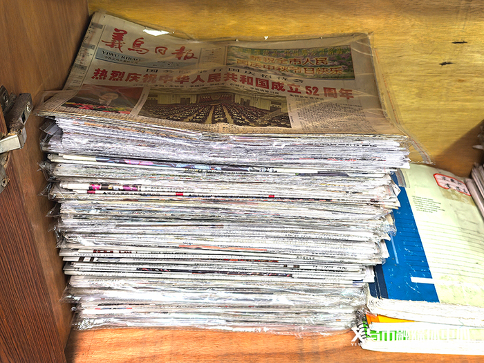 按地域分类是他另一种独特的整理方式。14个镇街的变迁报道各自成箱:赤岸的乡村旅游发展、苏溪的工业园区建设、廿三里的物流枢纽崛起……“这样方便翻看,这些年义乌每个地方的变化,在报纸的收纳里也一目了然。”他说。