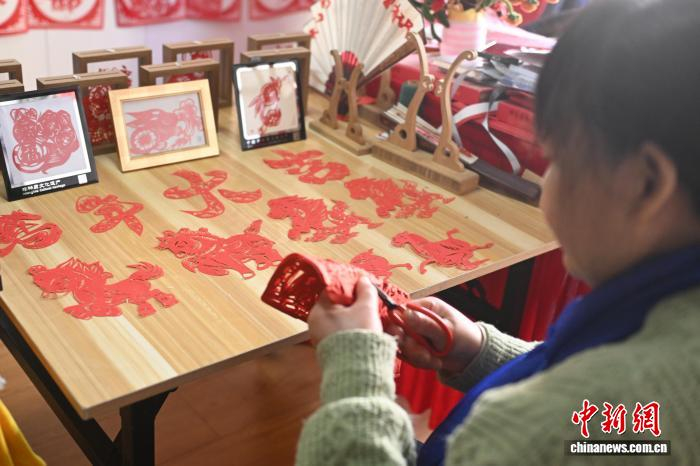 2月8日,在位于甘肃省兰州市一剪纸工作室内,甘肃剪纸艺人张旭创作马年剪纸作品。中新社记者 李亚龙 摄