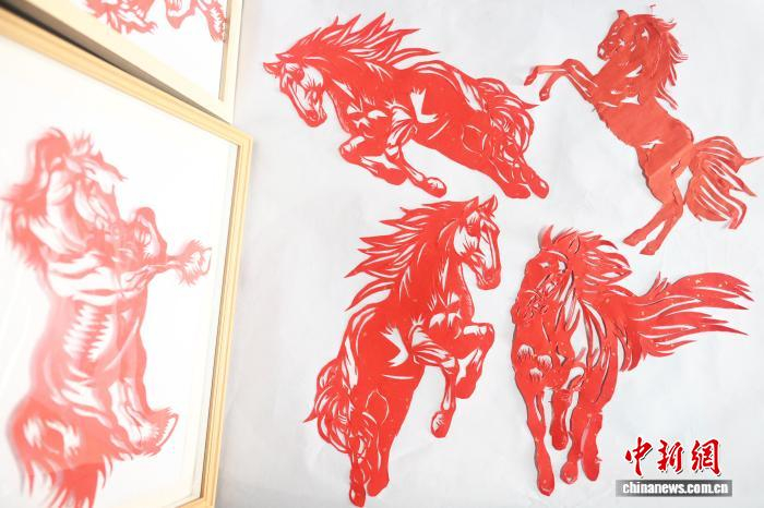 2月8日,在位于甘肃省兰州市一剪纸工作室内,展示的甘肃剪纸艺人张旭创作的马年剪纸作品。中新社记者 李亚龙 摄