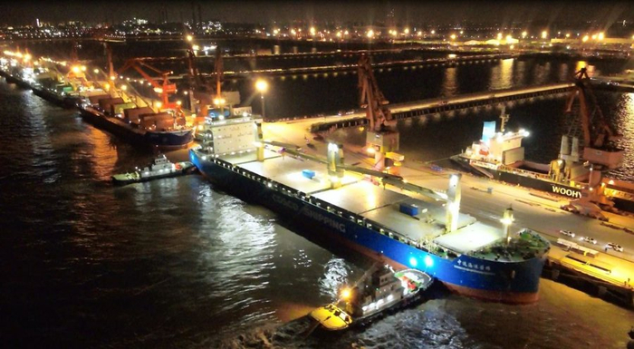 2月8日晚上9点许,上海港吴淞口岸的码头灯火通明,载运了近满船纸浆的“中远海运荣耀”轮,缓缓靠泊罗分码头5号泊位。